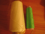業務用のウーリー糸(左)はやはりかなり場所をとるし、使うのは少量なので、右隣の巻き返しウーリーの量で十分でした。インターネットの糸屋さんボビンでわけていただいた糸筒(中)にボビンをテープで巻きつけてさらに小分けしました。自分で巻くとこんな感じ(右)。やはり巻いてもらったのはきれいだけど、まぁ仕方ないです。