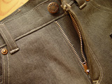 金属製のチャック、ベルトにタグとサイズタグ、洗濯ネーム、リベットの裏側も見えます。ジーンズ用のボタンですっきりしました。 |