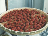 両腕でつくるいちばん大きな輪くらいの大きなざる(DIY店で見つけました。300円程度でした)に、梅干をのせ、3日くらい、昼間は日にあてて干し、夜は家の中にとりこむ、ということをします。ていねいに、一日に数回、はしでひっくり返します。97年はよく晴れてよかったのだけど、98年はなかなか晴れなくて・・・1週間くらいかかっても、まだ・・・でした。よく晴れた97年もののほうがおいしかったです・・・。今年はよく晴れてくれるといいのだけど。