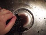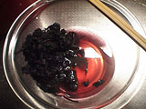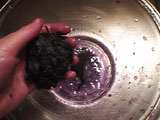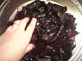 6. また塩でもんで、ぎゅっとしぼります。こんどはきれいな紫色で、泡のあるアク汁がでます。これも捨てます。 |