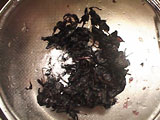 1999年からは畑で育てた自家製の赤しそです。梅3kgに対し、葉だけでたったの80gしかなかった(ほんとは3束、葉だけで750g必要)のですが、収穫したてで新鮮だったので、いい感じみたい。