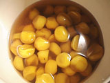 7. 下漬けしておいた梅の、重しと落し蓋をとります。重しをずっとしておいたおかげで、たっぷりと梅酢がでて、果肉もやわらかくなっています。 |