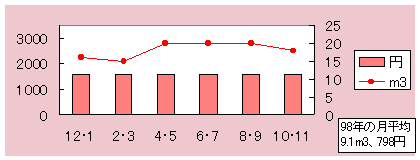 | メモ:3月はじめに引越し、3月は調整のため1ヶ月分です。引越して、量的には同じように推移してるのに、額があがりました。東京より、千葉のほうが水道料金が高いみたい。あと、広い家になって、口径が大きくなって、基本料があがったのが、痛いかなぁ。レバー式の蛇口だから、ちょっと気をつければ節水できて、水量はかわらないのに。 |