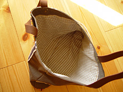 下底の別布部分には、以前に帽子のつば用にと買っておいた接着芯2種類のうち、薄いほうをはってみました。服地用の接着芯から考えたらかなりの厚地なので、底がしっかりしました。ほんとはマチのないパターンなのですが、マチをつくりました。これで本がたくさん入るねー。 |