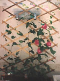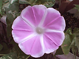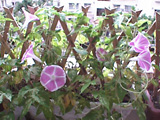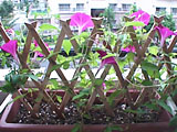 これは、makのお母さんにわけてもらった種から育ったもの。はやくに支柱をたててあげればよかったのに、遅くなってしまったので、あまり咲きがよくありません。でもこちらのほうがかわいい。 |