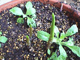 ![]() 1999/4/23 葉がひらいて、花茎がのびてます。わ〜い、今年は咲くんだ〜。 |