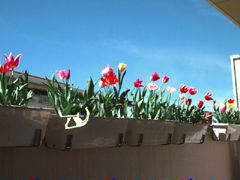 東京より、千葉のほうが暖かいみたい。会社のチューリップよりもずっと早く咲 き始めました。25日からのたった5日間の間に、これだけ咲き始めてしまったなん て、すごーーい。わーーい。 プランター5こに60球も植えたのです。からすのいたずらにもめげず、元気に咲 いてね。 |