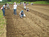 | まきかた1(手作業): うねは特につくらず、うね幅70cmx株間15cm、深さ3cmで2粒(りゅう)づつ、手まきしました。うね幅と株間は、生産者の方に線を引いてもらって、参加者、各自100粒以上を、しゃがんでは立って、しゃがんでは立ってを繰りかえしてまきました。1時間強(ようやく1人1うねの半分が終わるくらい・・・)かかりました(翌日、少し筋肉痛)。 | ![]() |