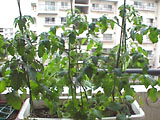 こちらは左のプランターの様子です。支柱よりもずっとずっと背が高くなって、芯をとめてもあっというまに伸びて次々花を咲かせています。頼もしいです。 |