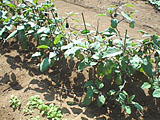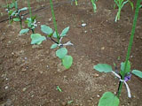 苗を植えて、支柱をたてました。こんな小さな苗で、ちゃんとなるかなぁ。 |