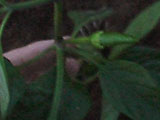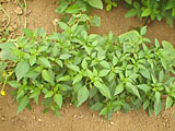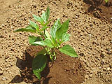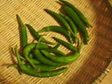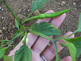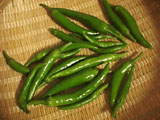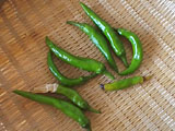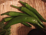 最初の収穫です。8こです。赤くなるまでまとうかと思ったのだけれど、地面に実がついてしまうと、茶色くなってしまうようなので、青いうちにとってしまうことにしました。しし唐よりも辛くて、おいしかったです。 |