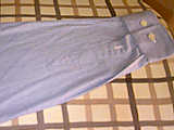 そでをそでぐりのほうからアイロンをかけます。手首のあたりは、右の写真のように、中からかけます。すこし体重をかけぎみにします。カフスの部分はとくにていねいにね。