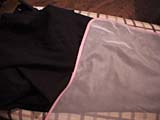 5. ベルト側を手前にして、チャックとタックの間を左右にかけます。タックは10cmくらいおさえれば、あとは自然に合流してくれるみたい。裏にボタンがある時は気をつけてちゃんとよけてね(上前)。