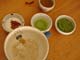 7:00、おかゆ、春菊、納豆(きざんで)、チーズ、麦茶。→おっぱい。